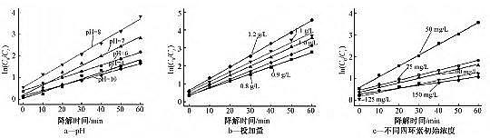 TiO2光催化氧化降解目标污染物的过程符合一级反应动力学方程。本研究分析了N-TiO2在不同pH值、催化剂投加量和四环素初始浓度条件下光催化氧化降解四环素的降解效果,并对这3组试验的反应过程进行降解动力学分析,拟合结果如图5和表1所示。