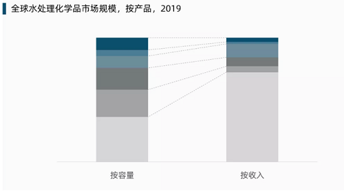 如前文所述,水处理化学品有诸多分类,由于不同种类产品的价格差异较大,导致分类市场中,容量市场占比与收入市场占比差距较大,像絮凝剂、pH调节剂价格相对便宜,而消泡剂、阻垢剂、缓蚀剂等价格相对较贵。